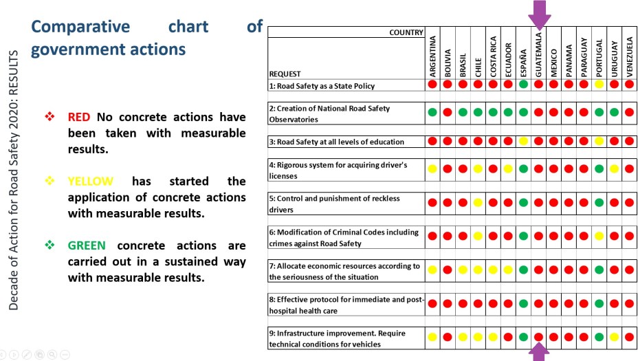 Hay 9 indicadores a medir en la 3era Conferencia Global sobre seguridad Vial que se desarrolló con el lema Logrando la Agenda 2030. Estos son: 1) Políticas del Estado, 2) creación de un observatorio nacional, 3) educación vial a todos los niveles, 4) sistema riguroso de licencias a conductores, 5) sistema de certeza de castigo, 6) modificaciones al Código Penal para categorizar los homicidios con un nivel más alto, 7) recursos económicos dispuestos para el problema central, 8) protocolos hospitalarios para los efectos de los siniestros, 9) infraestructura y condiciones de vehículos en mejores condiciones. Todo ha quedado como los semáforos de Los Próceres el viernes por la tarde: en rojo.