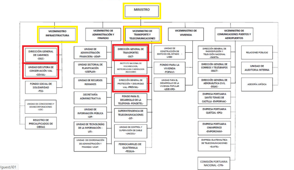 Son dos viceministerios, tres direcciones y una unidad ejecutora que se encargan de construir, mantener y supervisar la seguridad vial. El año pasado se adjudicaron 1.6 millones de quetzales, varias de esas obras relacionadas a la seguridad vial, ya sea por requisitos de la infraestructura como por proyectos de señalización que aún no se ven.