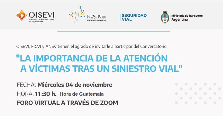 | En el marco del mes de RECUERDO A LAS VÍCTIMAS VIALES, FICVI ha organizado el conversatorio, sobre «La importancia de la atención a víctimas tras un siniestro vial», con la colaboración del Observatorio Iberoamericano de Seguridad Vial (OISEVI) y la Agencia Nacional de Seguridad Vial de Argentina (ANSV). El objetivo de esta actividad de carácter institucional e Iberomaericano, es continuar con el trabajo de visibilización sobre la importancia de contar con Unidades de Atención a Víctimas en los países de la región y compartir experiencias sobre las oficinas existentes y en formación. INSCRIPCIÓN ![]() Participantes: Jeanne Picard, Presidente de FICVI (España)Pablo Martínez Carignano, Director Ejecutivo de ANSV (Argentina)Álvaro Gómez Méndez, Secretario General de OISEVI (España) Estefanía Guzmán Rincón, Asesora de Despacho de la Secretaría Distrital de Movilidad, Bogotá. (Colombia) Sara Arce Moya, Fiscal Adjunta. Oficina de Atención a las Víctimas. (Costa Rica)Mariela Solari, Directora de la Unidad de Atención a Víctimas y Testigos de la Fiscalía General de la Nación. (Uruguay) Moderan: Gaby Lencina, Ex Responsable del Área Jurídica de UNASEV (Uruguay) Héctor D’Agostino, Responsable de Relaciones Internacionales de FICVI (Argentina) Conclusiones: Jeanne Picard, Presidente de FICVI (España) MIÉRCOLES 04 DE NOVIEMBRE A LAS 11:30, HORA DE GUATEMALA vía ZOOM. INSCRIPCIÓN GRATUITA |
