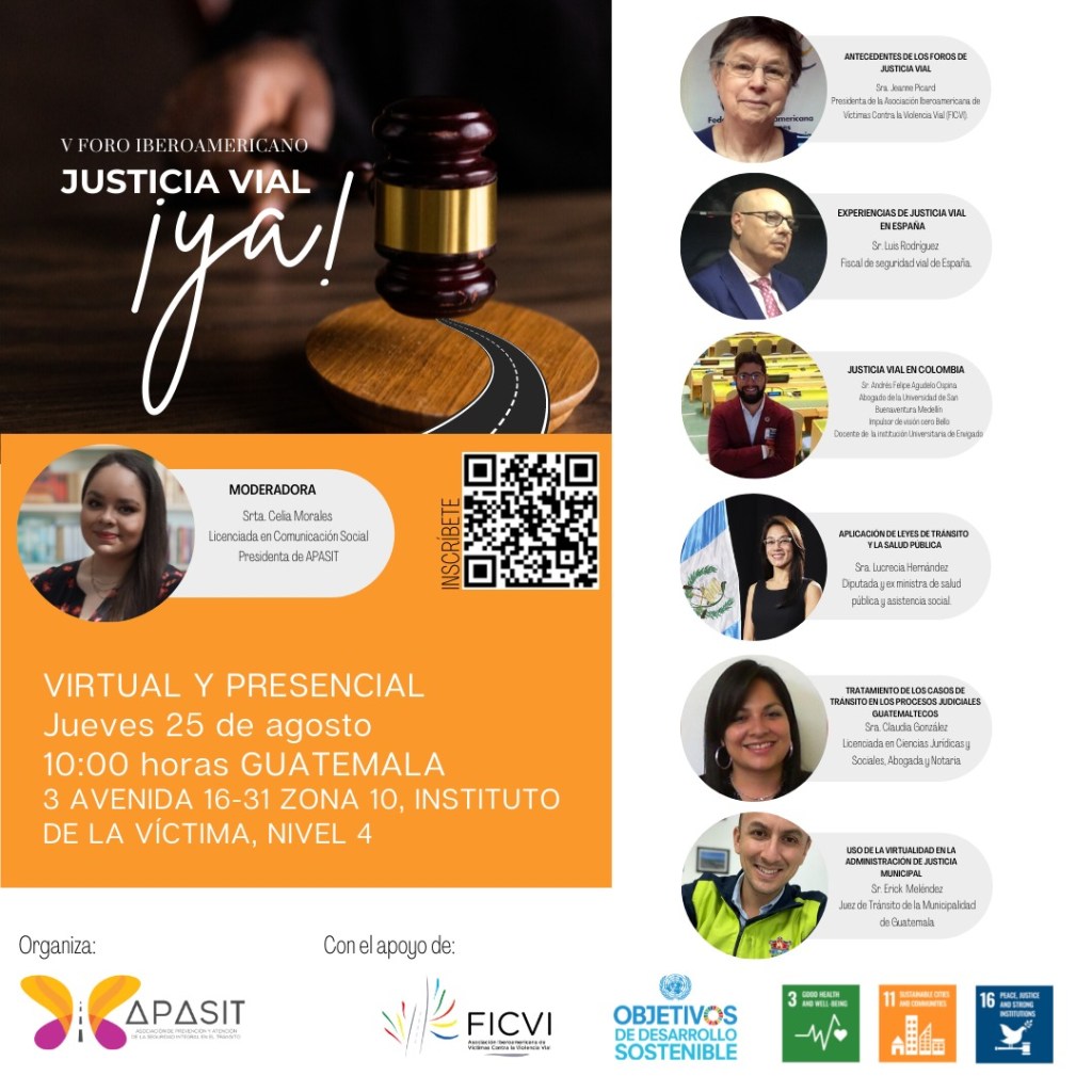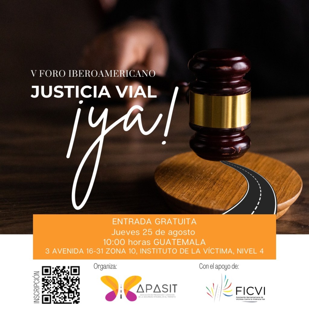 La Asociación Iberoamericana Contra la Violencia Vial (FICVI) y la Asociación de Prevención y Atención de la Seguridad en el Tránsito (APASIT) invitan al V Foro Iberoamericano de Justicia Vial en Guatemala. Es un espacio de análisis e identificación de causas por las que cada día sigue subiendo el número de hechos de tránsito en la región.