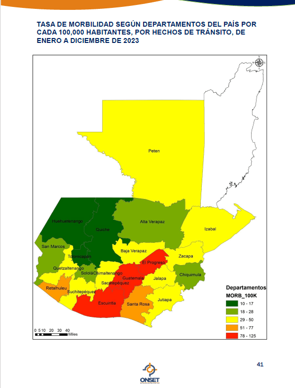 Según datos del ONSET (2023), una de la tendencia de muertes y lesiones relacionadas a hechos de tránsito están en los departamentos de Escuintla (ruta a la Playa Sur), El Progreso (ruta al Atlántico) y Guatemala (área metropolitana) nótese en el mapa el coloreado en rojo.