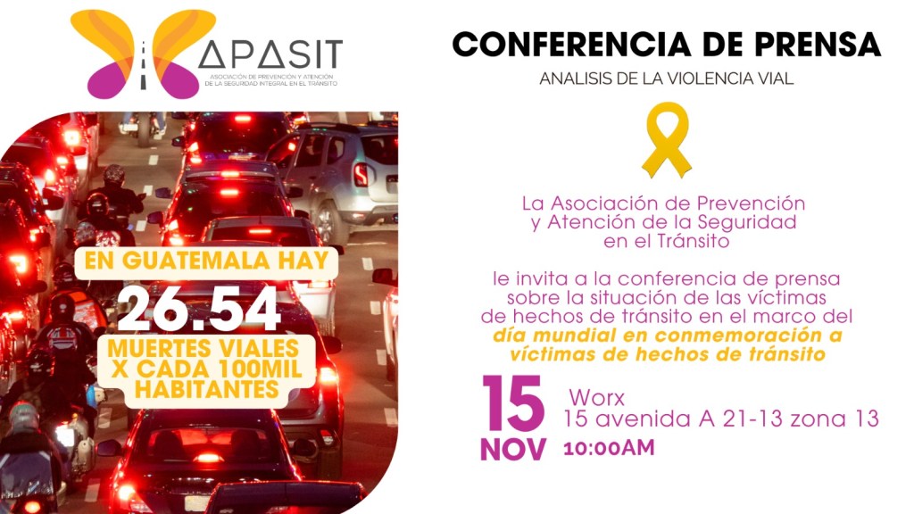 Este tercer domingo de noviembre, Guatemala se suma a la conmemoración internacional del Día en Memoria de las Víctimas de Hechos de Tránsito, establecido por decisión de la Asamblea General de las Naciones Unidas. En esta fecha, honramos a todas las personas que han perdido la vida o han sufrido lesiones graves a causa de siniestros viales, y reafirmamos nuestro compromiso por prevenir y evitar estas tragedias.